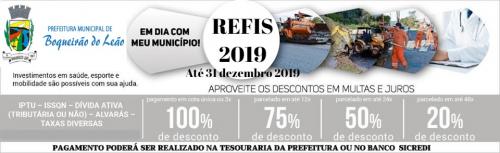 Com o objetivo de facilitar e simplificar o pagamento do IPTU, ISSQN, DÍVIDA ATIVA, ALVARÁS, HORAS MÁQUINAS, VETERINÁRIO INSEMINAÇÃO ARTIFICIAL, TROCA TROCA SEMENTES, TAXAS DIVERSAS, foi criado o REFIS (Programa de Recuperação de Créditos Municipais) a partir da lei municipal nº 1876 de 06 de Novembro de 2019
