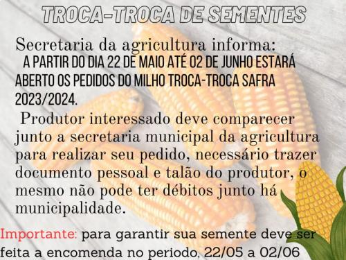 Secretária da agricultura informa: A PARTIR DO DIA 22 DE MAIO ATÉ 02 DE JUNHO ESTARÁ ABERTO OS PEDIDOS DO MILHO TROCA-TROCA SAFRA 2023/2024