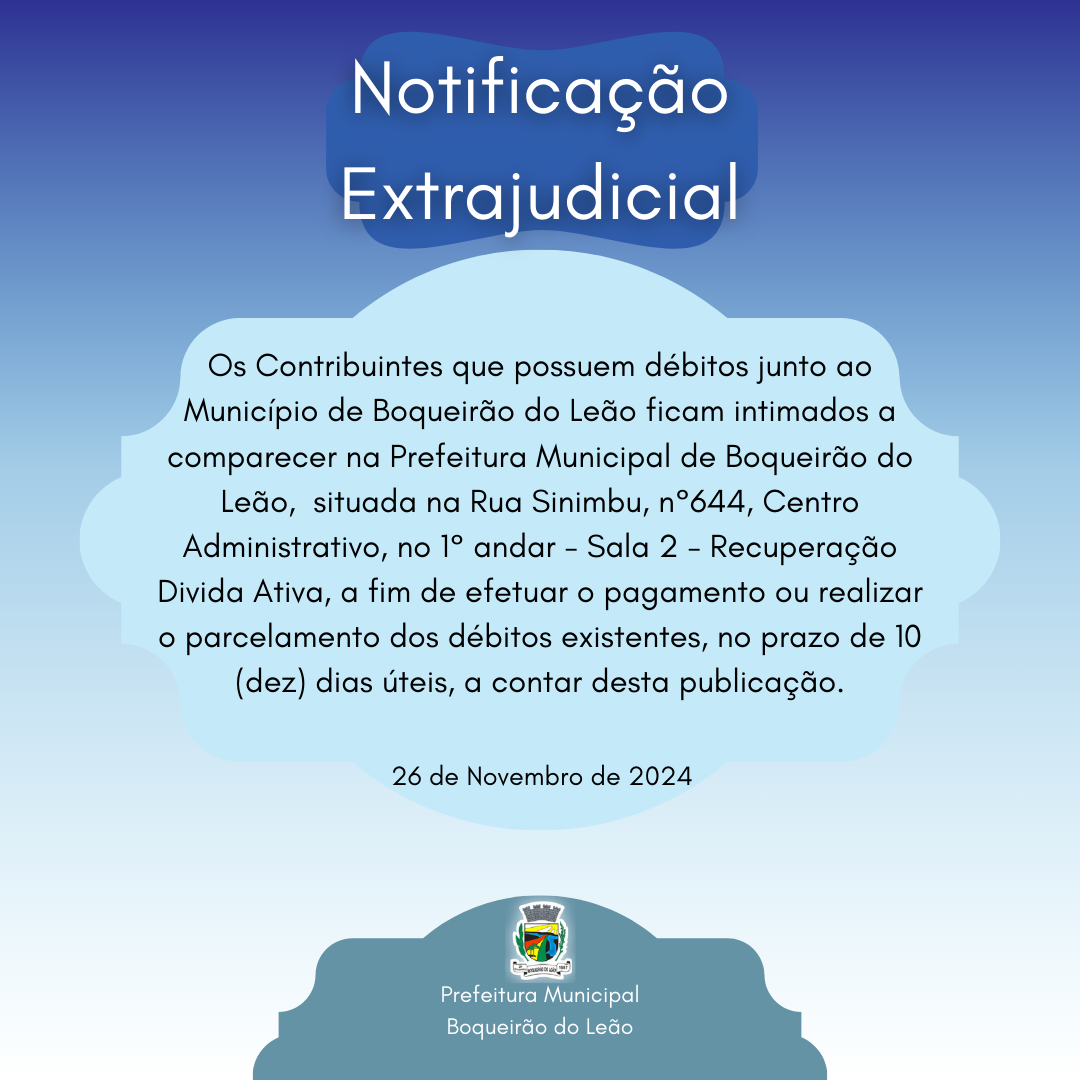 I - Os contribuintes que possuem débitos junto ao Município de Boqueirão do Leão ficam intimados a comparecer na Prefeitura Municipal de Boqueirão do Leão, situada na Rua Sinimbu, n°644, Centro Administrativo, no 1° andar - Sala 2 - Recuperação de Divida Ativa, a fim de efetuar o pagamento ou realizar o parcelamento dos débitos existentes, no prazo de 10 (dez) dias úteis, a contar desta publicação.