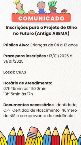 Inscrições para PROJETO DE OLHO NO FUTURO (Antiga ASEMA)